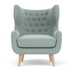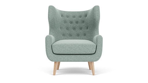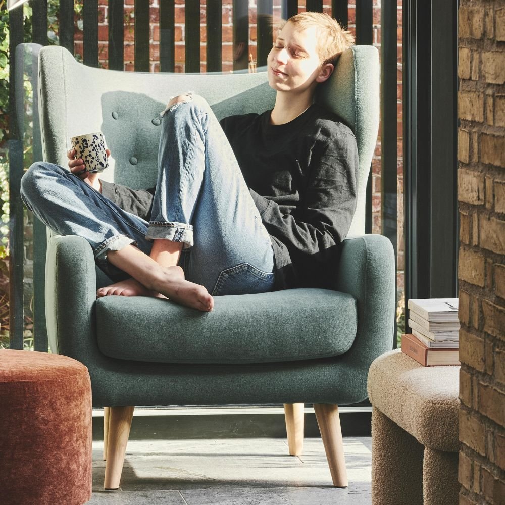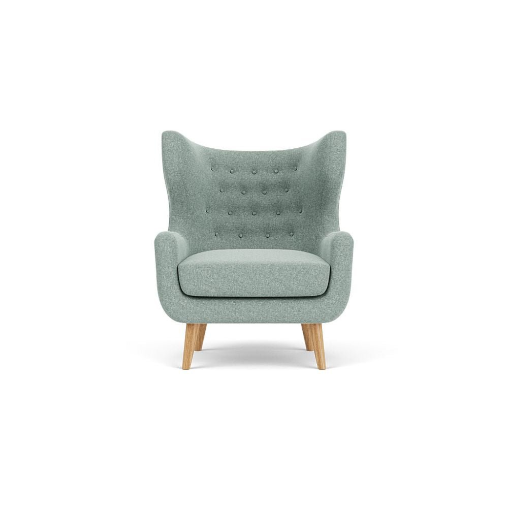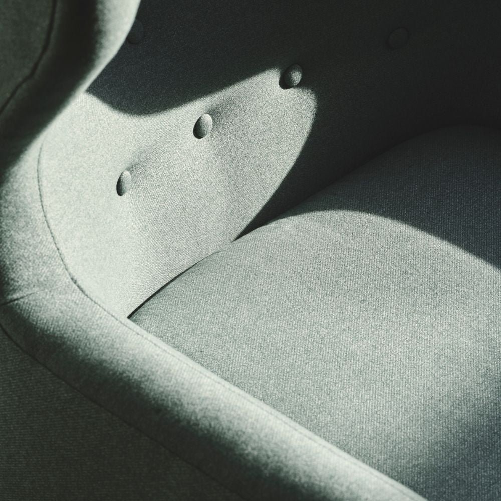 A classic wingback chair reimagined. The 18 fabric buttons in the backrest compliment the angled wooden legs, providing character and charm to this ultra cool chair. Authentic Danish Design – direct to you.