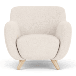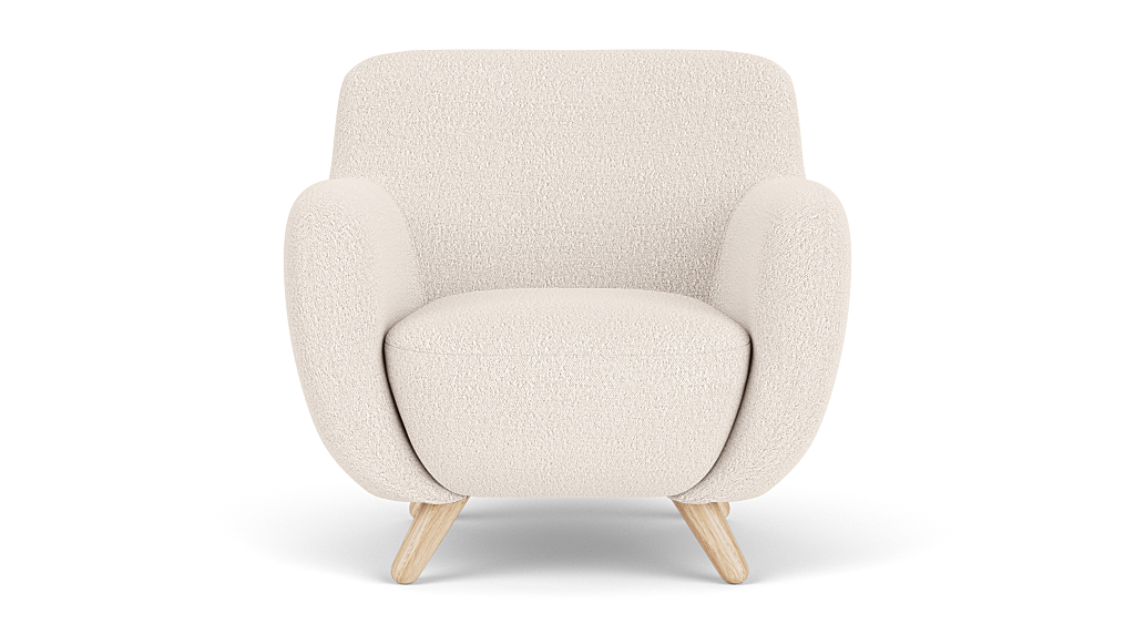 Otis was created based on the idea of ​​scaling down a classic old-school armchair so that it could fit better into the small home. With its round shape and the narrow angled legs, Otis is both sweet to look at and really good to sit in. Here he is upholstered in an off white bouclé which highlights his round and soft look.